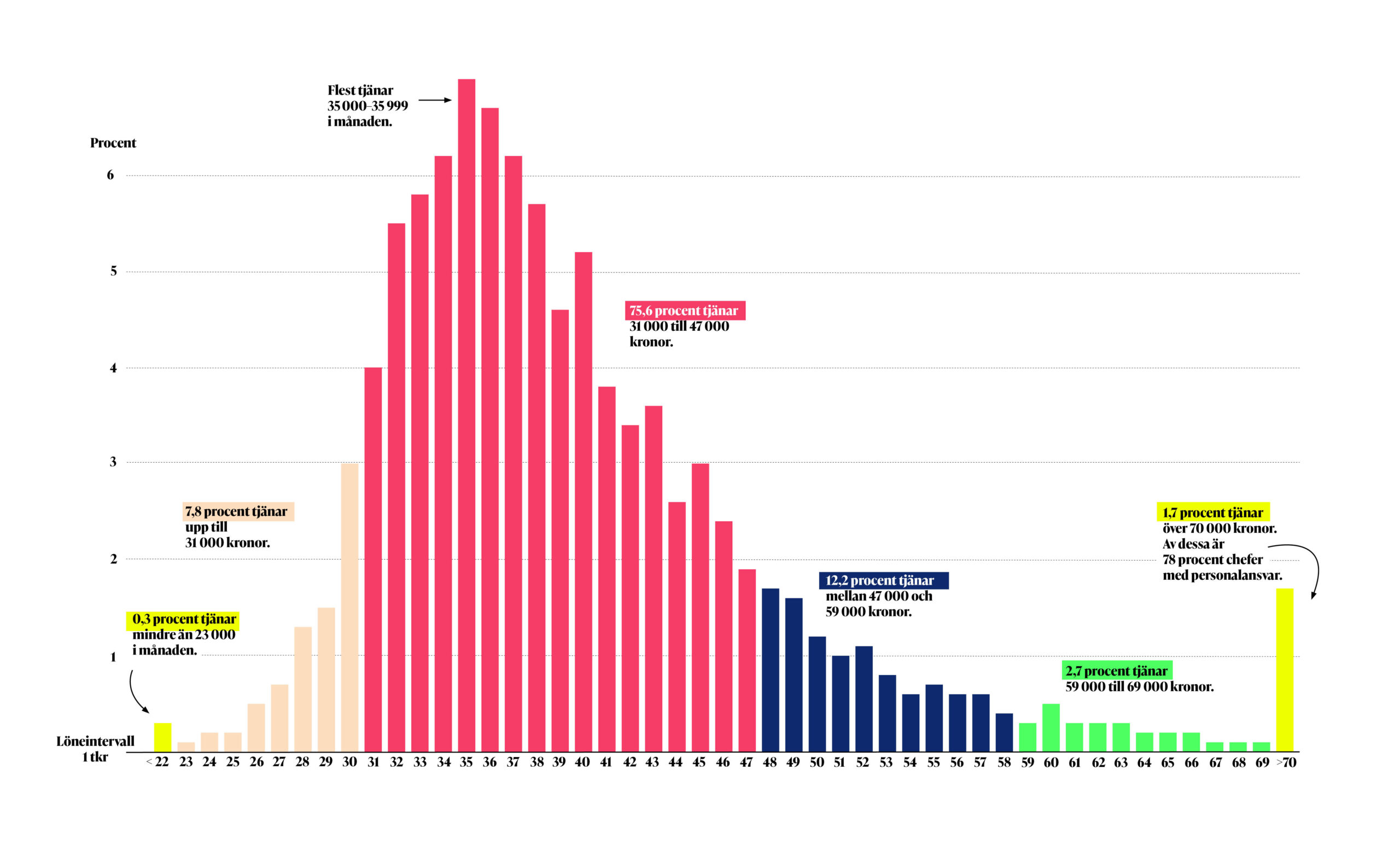 I Magasin K:s diagram har lönerna har grupperats i spann där varje stapel rymmer den angivna lönen samt hundratalen upp till nästa stapel, till exempel 40 000 till 40 999 kronor.